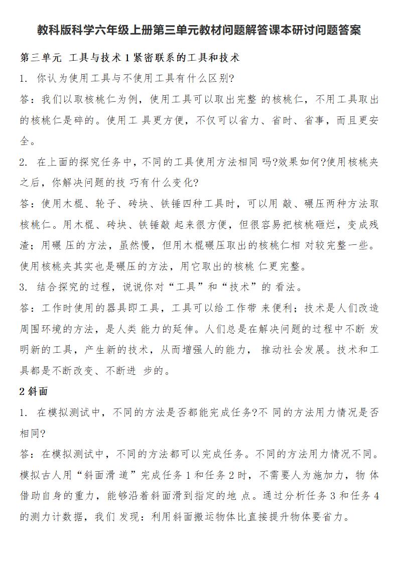 教科版科学六年级上册第三单元教材问题解答课本研讨问题答案,仅提供网盘下载,如介意,请不要下载。