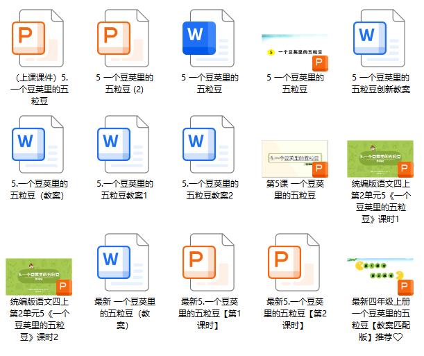 新部编版四年级上册《语文》一个豆荚里的五粒豆课件打包【ppt版】9个+教案【word版】6个,此课件包为转载自课件站{kjzhan},仅提供网盘下载,如介意,请不要下载。